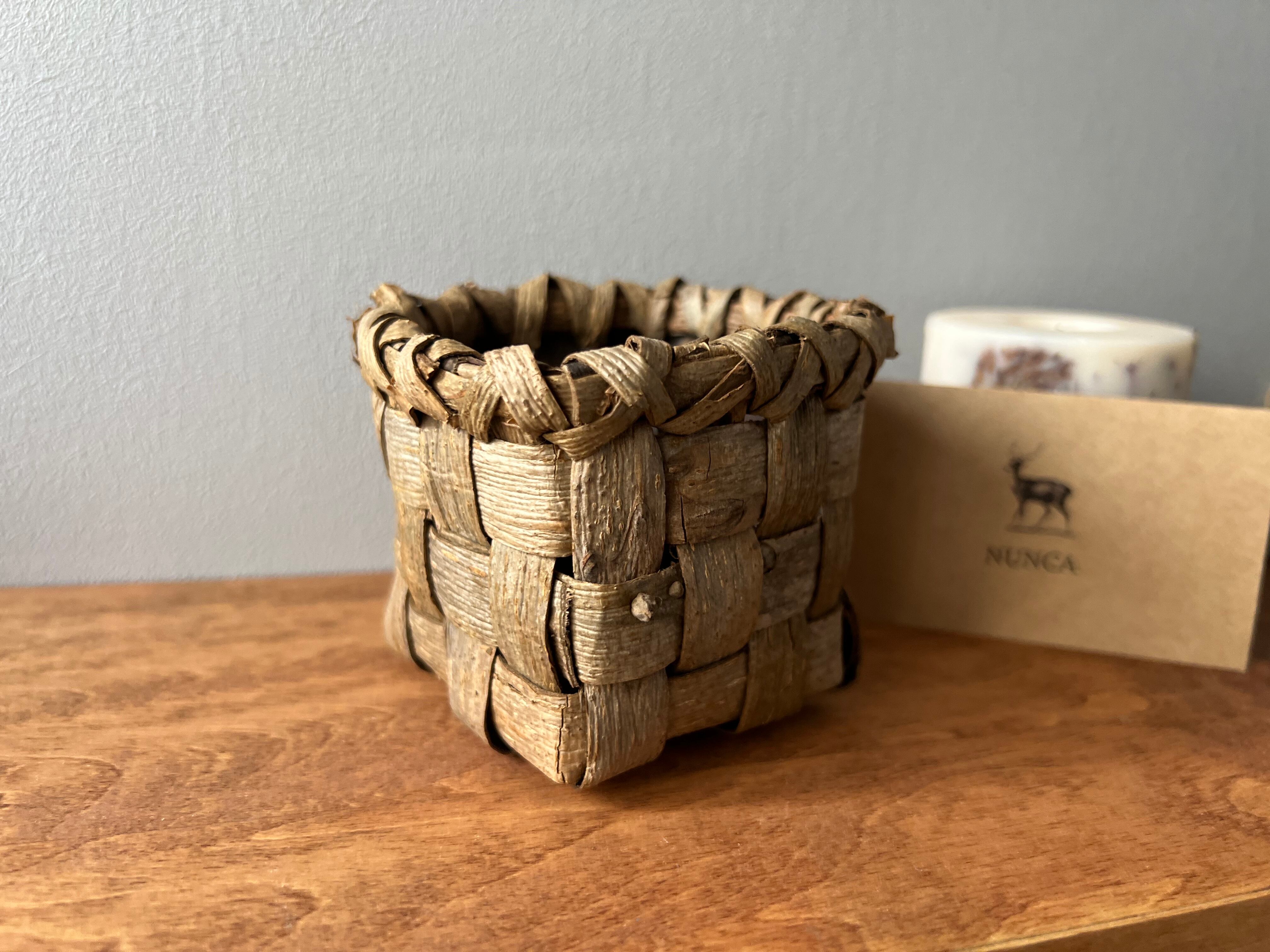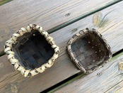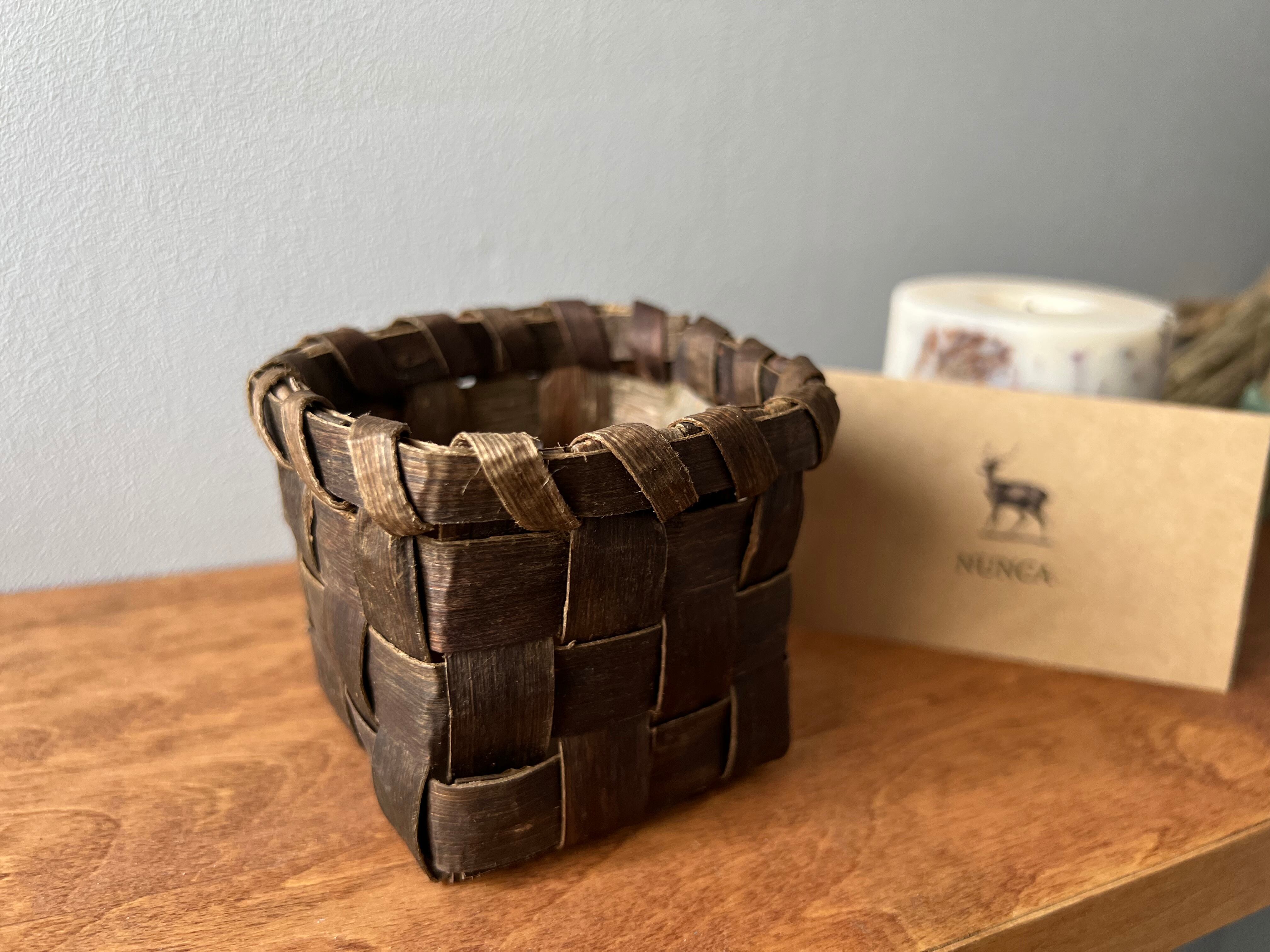 同じ5㎝の型で作りましたが、白→表はどこか丸く優しい籠に、黒→裏はきっちりビシッと正方形になりました、節もありますし胡桃の樹皮は表情豊かで同じものはありません。