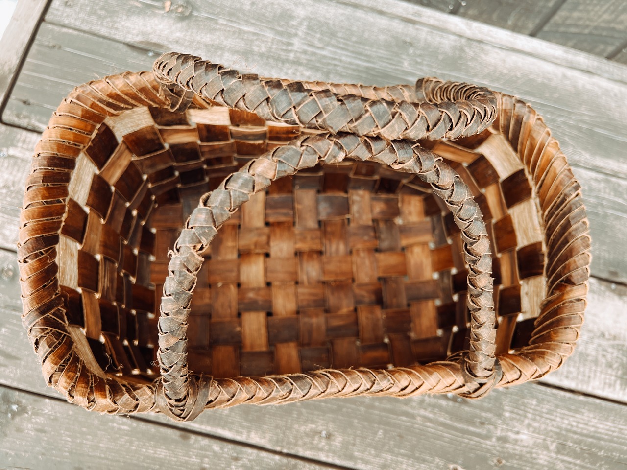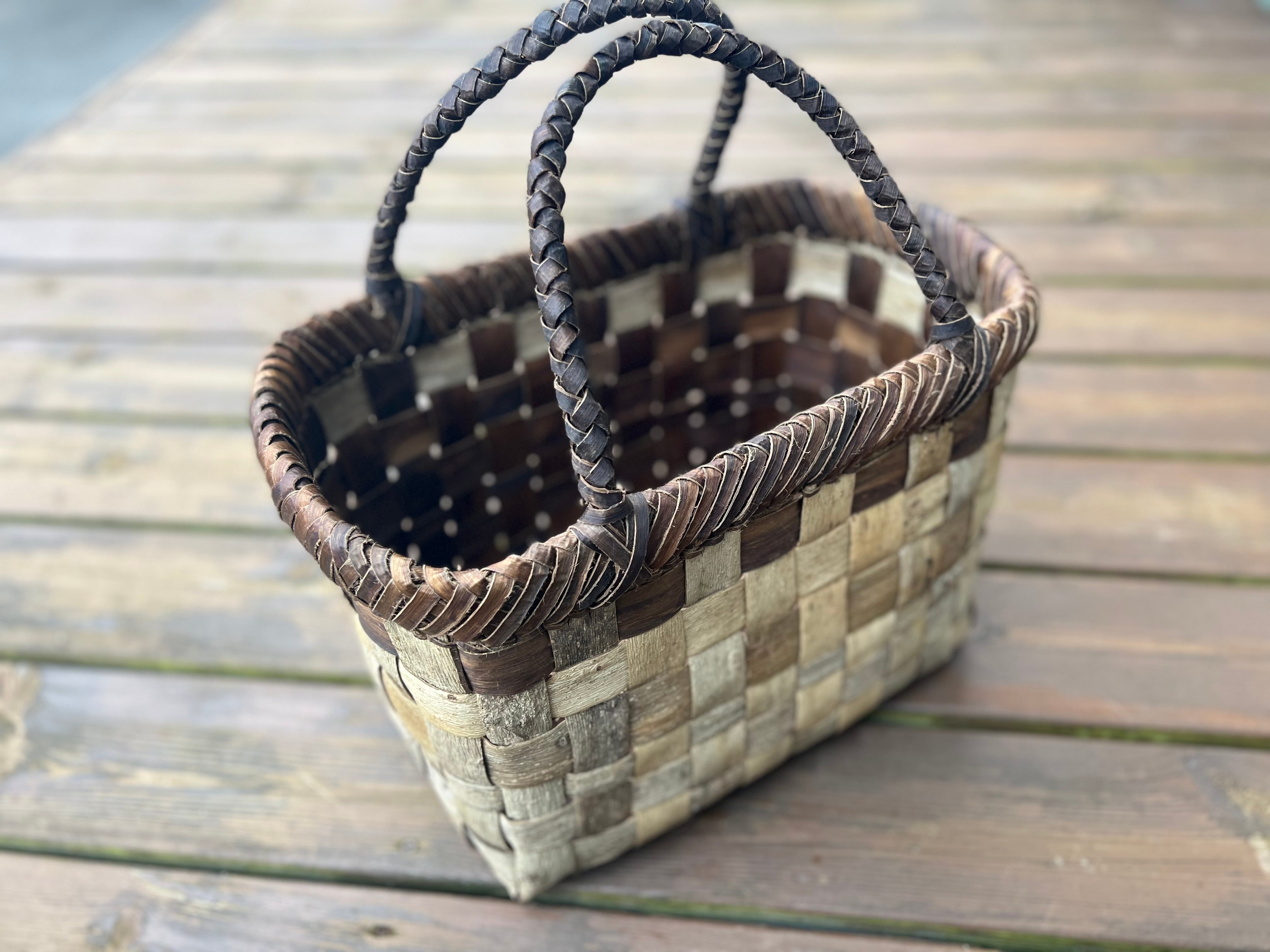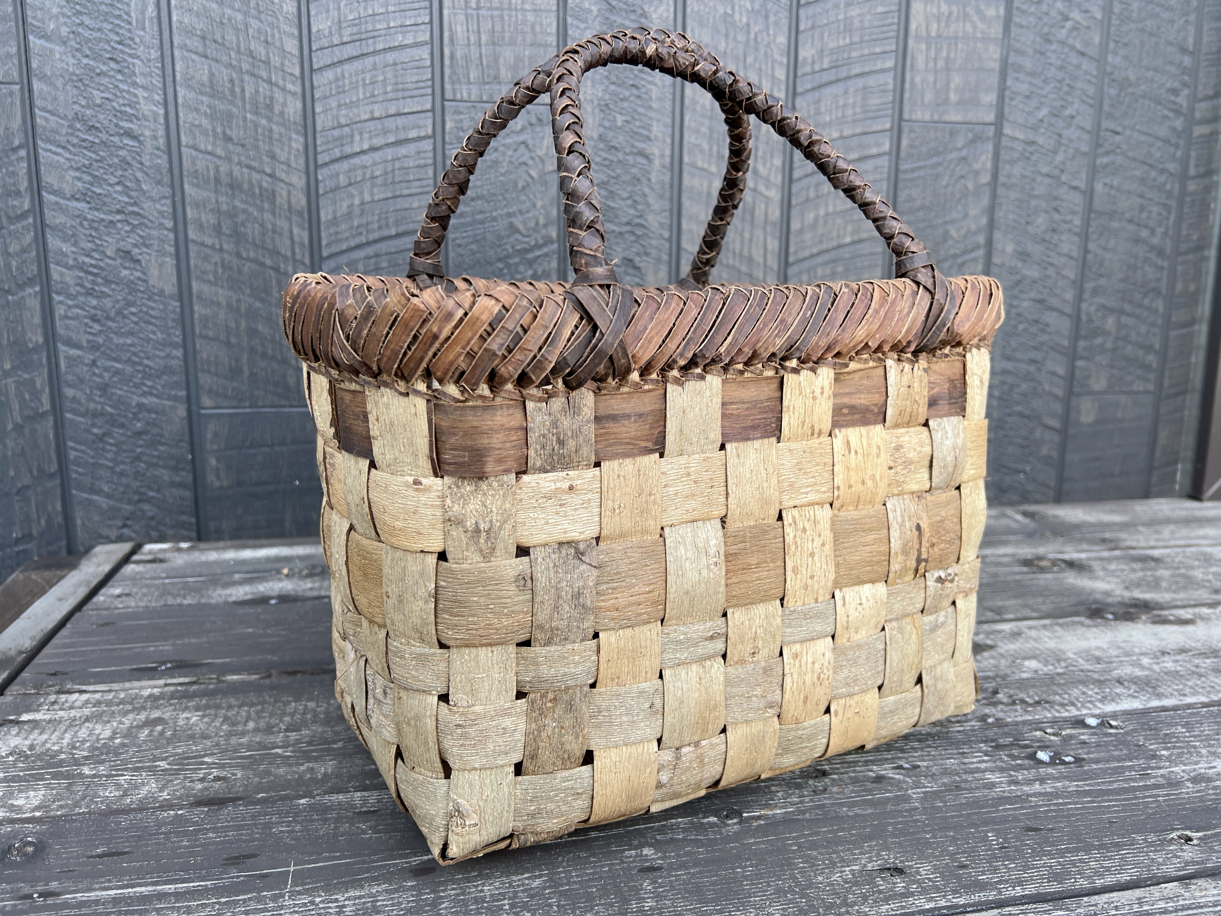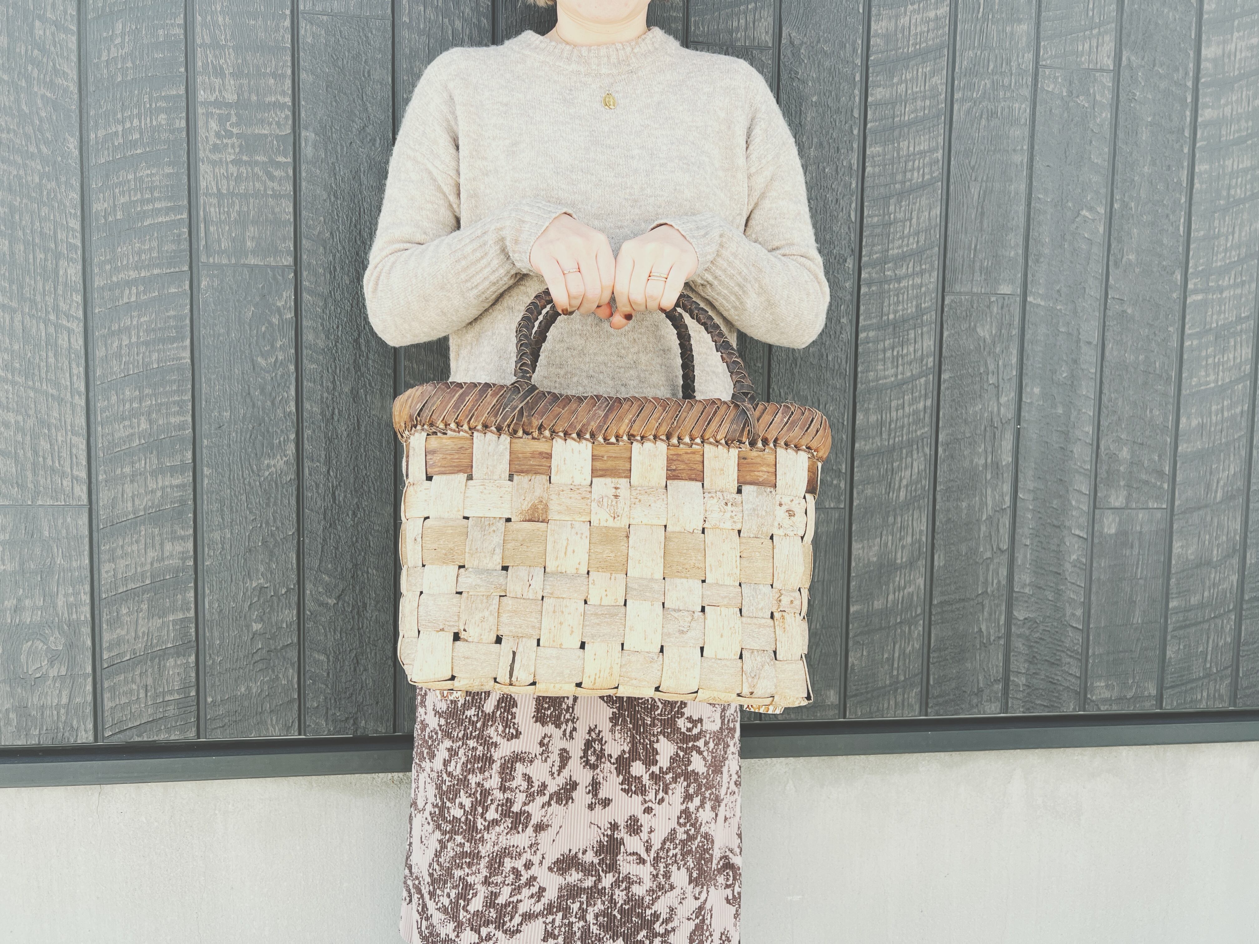 縦・横幅、奥行がしっかりあり存在感のある市場籠サイズ、胡桃樹皮特有の太く自然のままの表情が魅力的です。